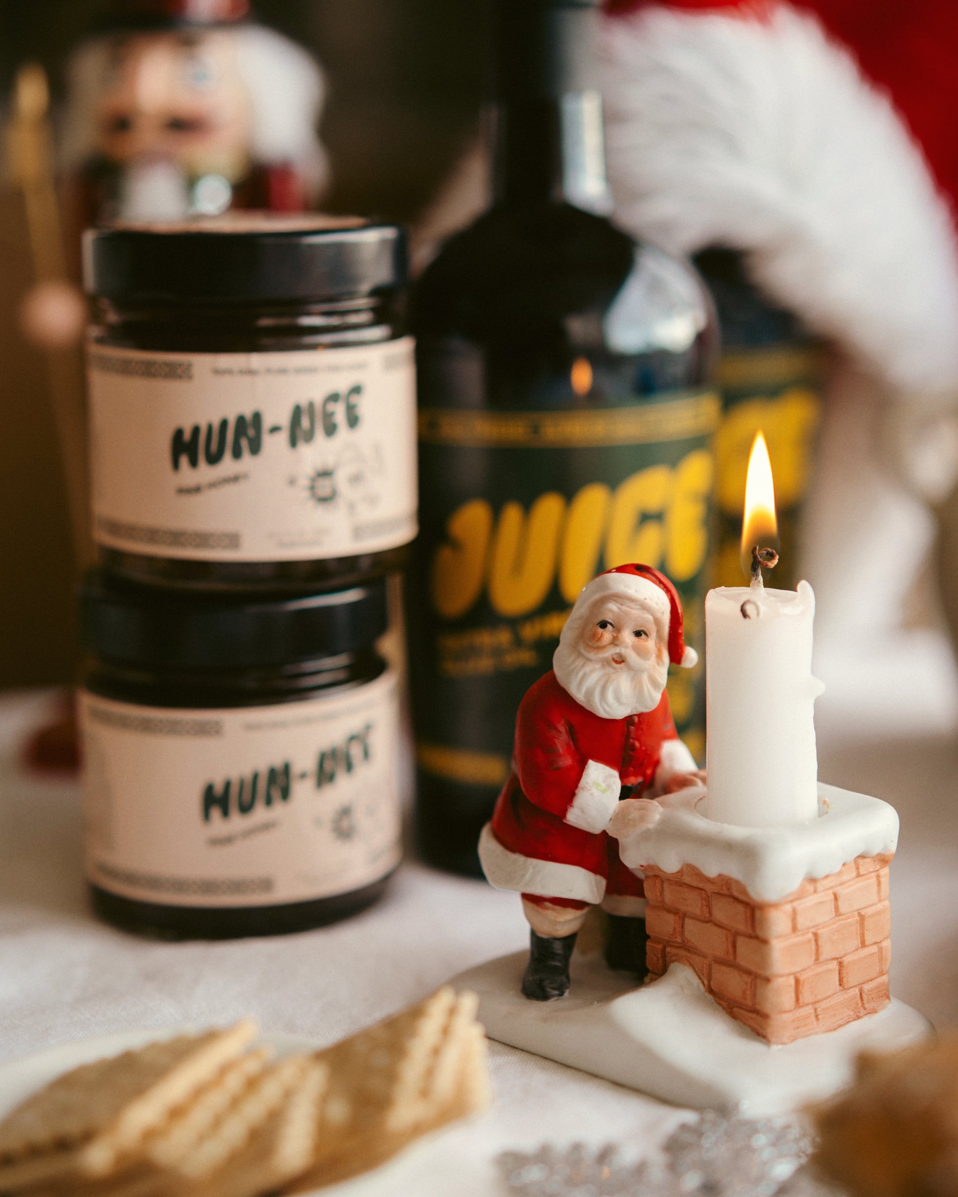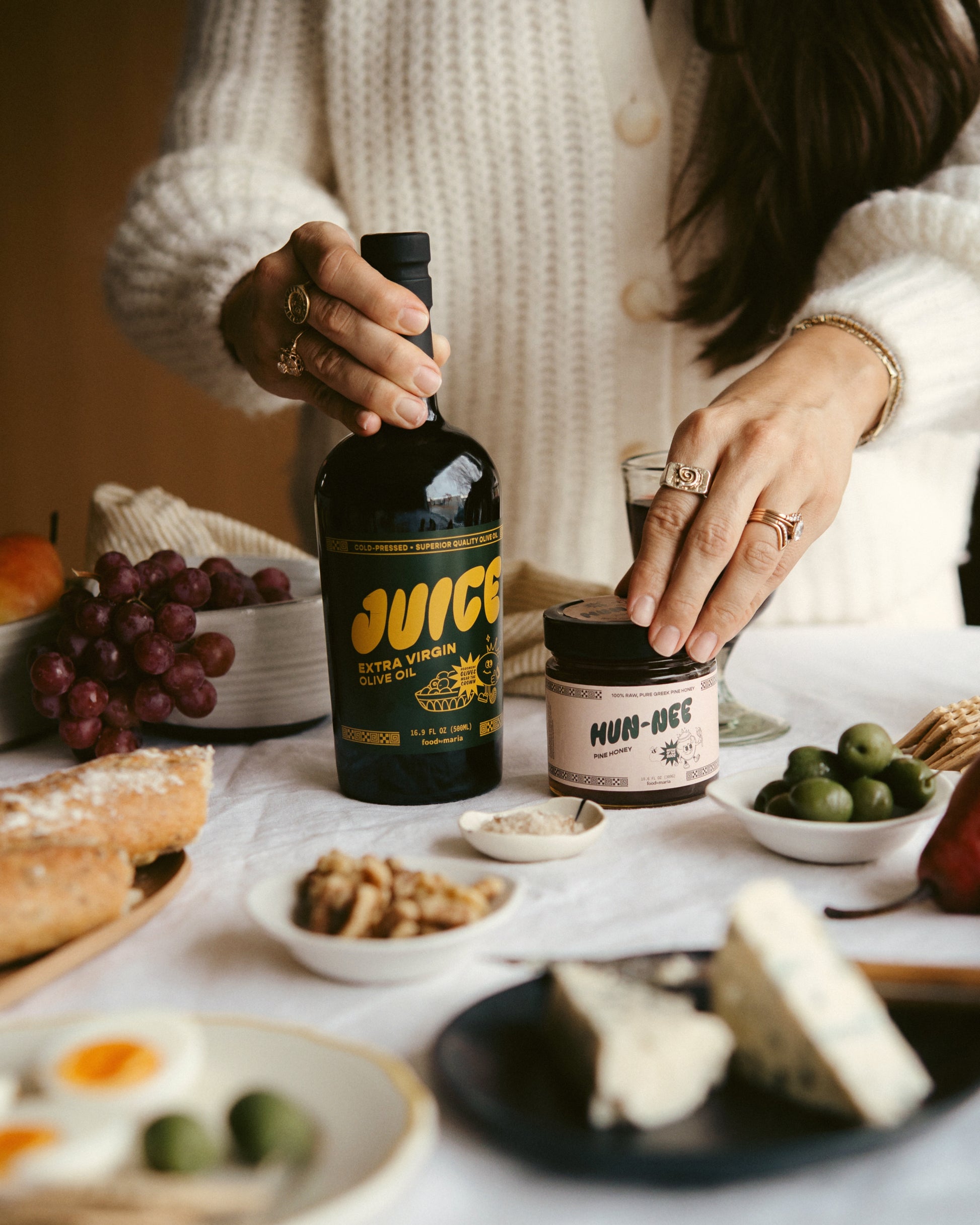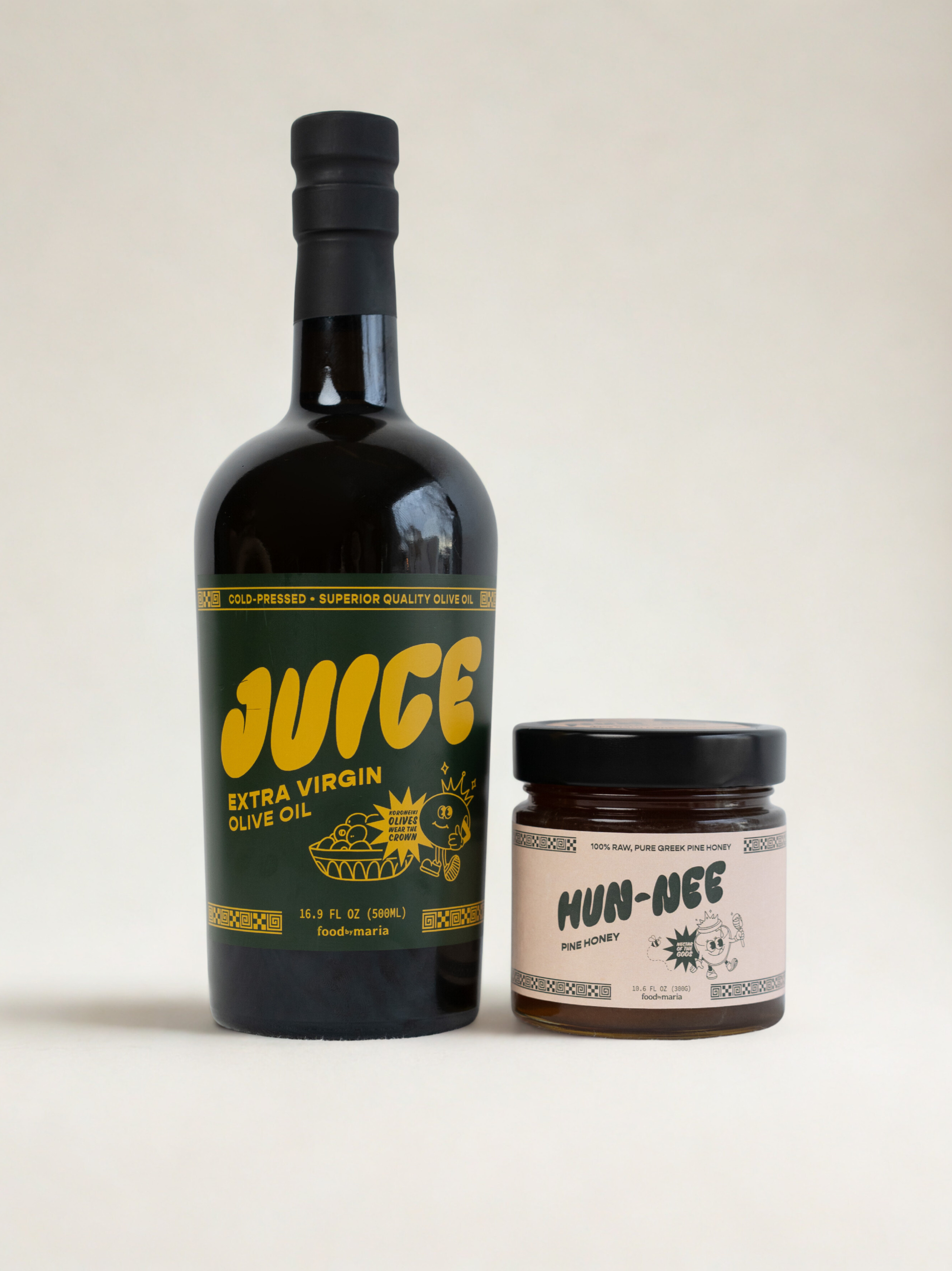 JUICE, a single-origin extra virgin olive oil from Messenia, meets HUN-NEE, raw pine honey from the forests of Thasos.